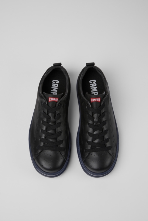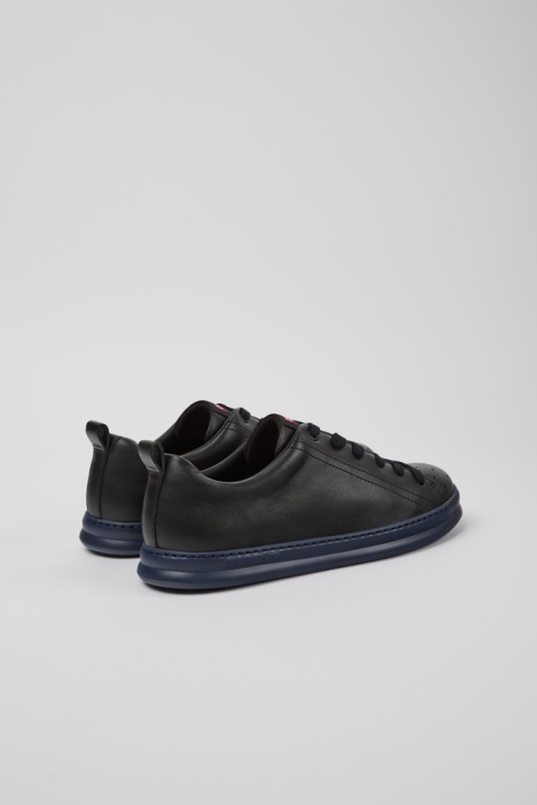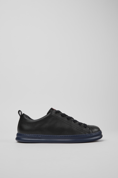 Μαύρο ανδρικό Sneaker. Ολόσωμη δερμάτινη σόλα και μπλε εξωτερική σόλα. Τα ανδρικά αθλητικά παπούτσια Runner προσφέρουν χαλαρή εμφάνιση με απαλό δέρμα και σπορ σιλουέτα σε επανασχεδιασμένο στυλ, βγαλμένο από τα αρχεία μας.