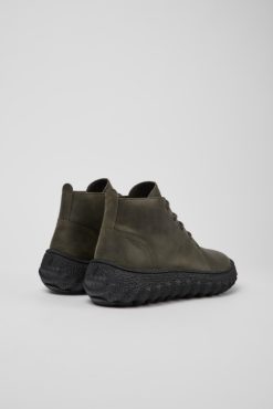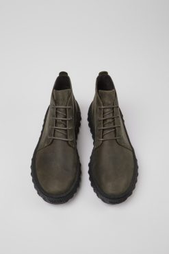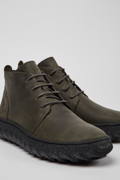 Σκούρα πράσινα ανδρικά παπούτσια Nubuck με πατώματα OrthoLite® Recycled™ και εξωτερικές σόλες από καουτσούκ Michelin (27% φυσική). Το έδαφος επαναπροσδιορίζει το αστικό Street Style προσθέτοντας μια σύγχρονη πινελιά στη βιομηχανική αισθητική Camper.