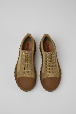 Μπεζ υφασμάτινα και δερμάτινα γυναικεία παπούτσια με πατώματα OrthoLite® Recycled™ και εξωτερικές σόλες από καουτσούκ Michelin (27% φυσική). Το έδαφος επαναπροσδιορίζει το αστικό Street Style προσθέτοντας μια σύγχρονη πινελιά στη βιομηχανική αισθητική Camper.