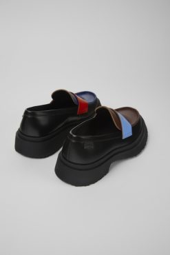 Μαύρα δερμάτινα γυναικεία Loafers με πολύχρωμες λεπτομέρειες και λαστιχένιες σόλες. Γεννημένος το 1988, το Concept TWINS αμφισβητεί την ιδέα ότι τα παπούτσια πρέπει να είναι πανομοιότυπα, παρουσιάζοντας αταίριαστα στυλ που είναι πραγματικά μοναδικά.