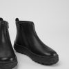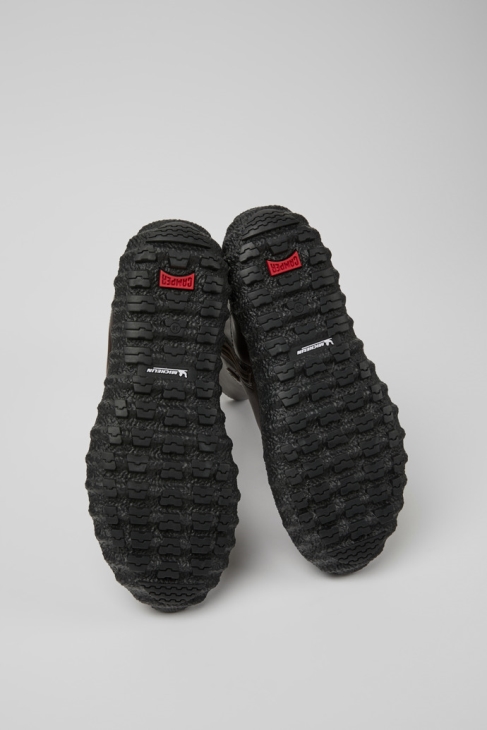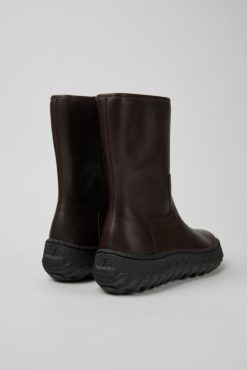 Σκούρο καφέ δερμάτινες γυναικείες μπότες με πατώματα OrthoLite® Recycled™ και εξωτερικές σόλες από καουτσούκ Michelin (27% φυσικό). Το έδαφος επαναπροσδιορίζει το αστικό Street Style προσθέτοντας μια σύγχρονη πινελιά στη βιομηχανική αισθητική Camper.