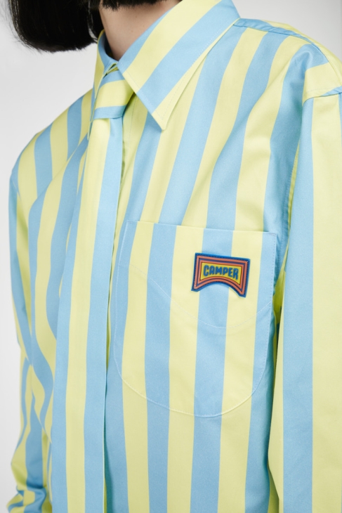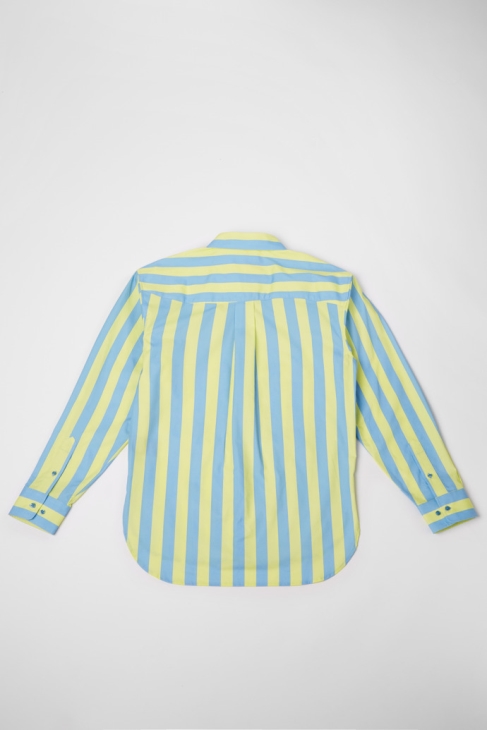 Μπλε και κίτρινο ριγέ Unisex πουκάμισο με γιακά και αποσπώμενη γραβάτα. 100% οργανικό βαμβάκι. Αντικατοπτρίζοντας το ελεύθερο πνεύμα της σεζόν, η συλλογή Apparel συνδυάζει φρέσκα χρώματα με ένα μοτίβο κυμάτων που θυμίζει ηλιόλουστες μέρες στην παραλία. Μέγεθος και FitUnisex Σχεδιασμένο για χαλαρή και υπερμεγέθη εφαρμογή Το ανδρικό μοντέλο είναι 187 Cm και φοράει μέγεθος M Το γυναικείο μοντέλο είναι 179 Cm και φοράει μέγεθος M