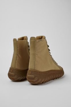 Μπεζ υφασμάτινα και δερμάτινα γυναικεία μποτάκια με ανακυκλωμένες μεμβράνες Primaloft®, πατώματα OrthoLite® Recycled™ και εξωτερικές σόλες από καουτσούκ Michelin (27% φυσικό). Το έδαφος αναπαράγει το Urban Street Style προσθέτοντας μια σύγχρονη πινελιά στη βιομηχανική αισθητική Camper.