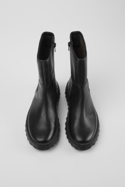 Μαύρες δερμάτινες γυναικείες μπότες με πατώματα OrthoLite® Recycled™ και εξωτερικές σόλες από καουτσούκ Michelin (27% φυσικό). Το έδαφος αναπαράγει το αστικό στυλ του δρόμου προσθέτοντας μια σύγχρονη πινελιά στη βιομηχανική αισθητική Camper.