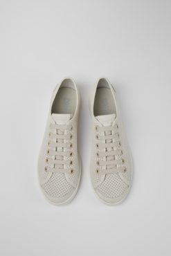 Μπεζ και λευκά γυναικεία πάνινα παπούτσια Nubuck και δερμάτινα με 100% εξωτερικές σόλες από καουτσούκ. Τα αθλητικά παπούτσια Uno με χαμηλή κορυφή διαθέτουν κομψή σιλουέτα και διαπνέον διάτρητο δερμάτινο επάνω μέρος.