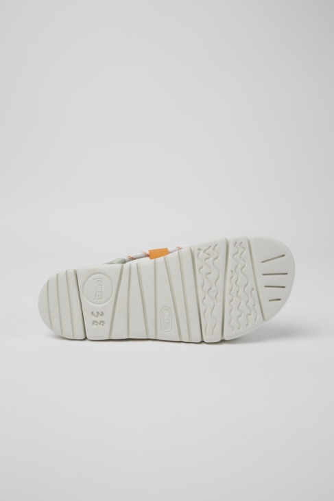Λευκά, πράσινα και πορτοκαλί δερμάτινα και ανακυκλωμένα γυναικεία σανδάλια με ιμάντες PET με εξωτερικές σόλες XL EXTRALIGHT® Organix™ (30% ζαχαροκάλαμο βιολογικής βάσης). Ισπανικά για την «κάμπια», τα γυναικεία πέδιλά μας Oruga προσφέρουν ευέλικτες, ελαφριές σόλες και αστική καλοκαιρινή εμφάνιση.