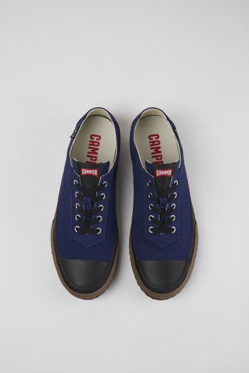 Μπλε ανδρικά πάνινα παπούτσια από ανακυκλωμένο βαμβάκι με αφαιρούμενα πατώματα OrthoLite Recycled και εξωτερικές σόλες από καουτσούκ (40% φυσικό, 23% ανακυκλωμένο). Το Camaleon, το πρώτο παπούτσι της Camper, αποτελεί την επιτομή της απλότητας και της επινοητικότητας της μεσογειακής κληρονομιάς της. Εμπνευσμένο από τα ρουστίκ παπούτσια που φορέθηκαν πριν από έναν αιώνα, το Camaleon προτείνει έναν πιο προσεκτικό τρόπο περπατήματος και εξερεύνησης.