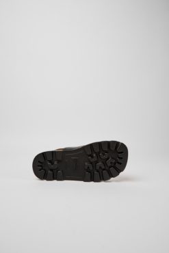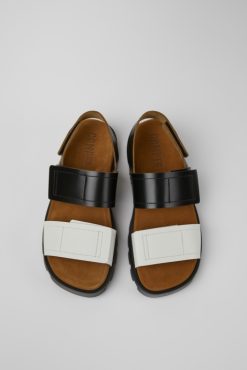 Ασπρόμαυρα δερμάτινα γυναικεία σανδάλια με σύστημα κλεισίματος με γάντζο και κρίκο και εξωτερικές σόλες XL EXTRALIGHT® 100% EVA. Μια νέα προσθήκη στην εμβληματική οικογένεια Brutus της Camper, αυτό το μινιμαλιστικό πέδιλο διαθέτει φυσικά υλικά και εξαιρετικά ελαφριά σόλα.