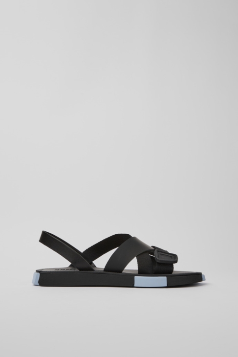 Μαύρα δερμάτινα και ανακυκλωμένα ανδρικά σανδάλια με ιμάντες PET με EVA και σόλες από καουτσούκ (20% ανακυκλωμένο) και σύστημα κλεισίματος με γάντζο και βρόχο. Το σετ μας είναι ένα ελαφρύ στυλ με ιμάντες πολλαπλών υλικών κατασκευασμένο με ανακυκλωμένα υλικά που υποστηρίζουν το πόδι και τον πλανήτη.