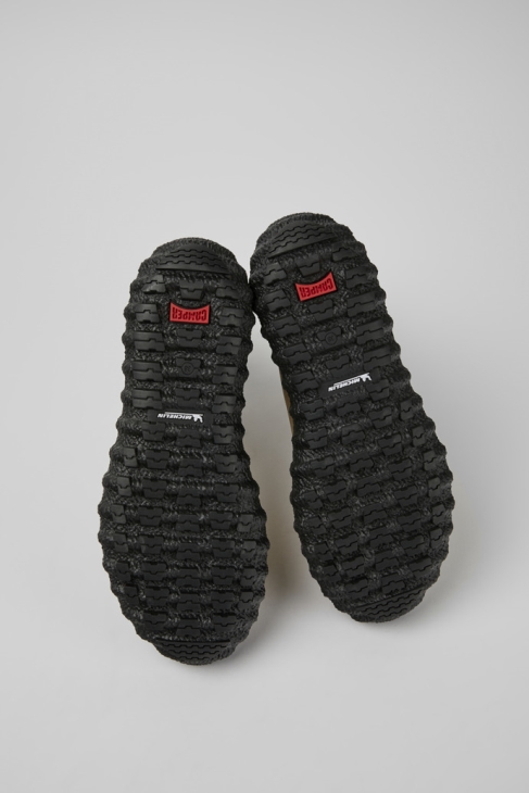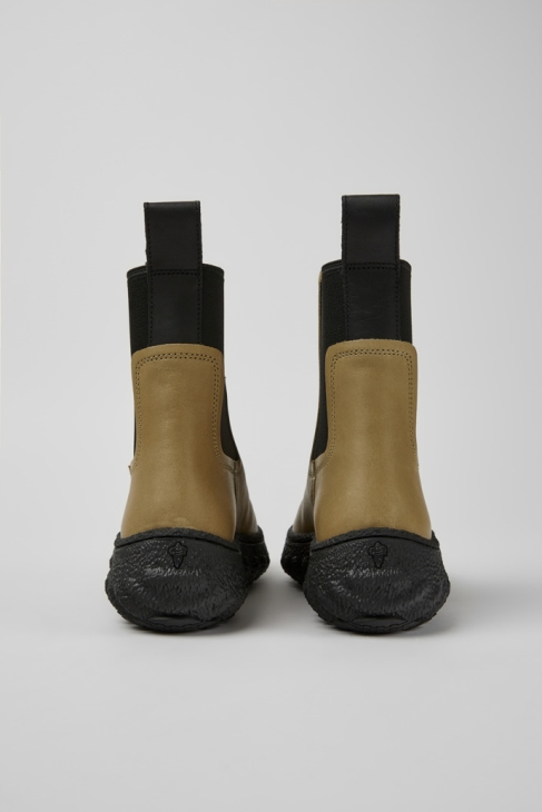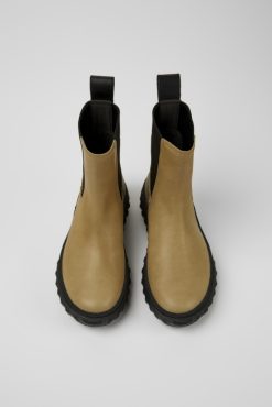 Μπεζ δερμάτινα γυναικεία μποτάκια με πατώματα OrthoLite® Recycled™ και εξωτερικές σόλες από καουτσούκ Michelin (27% φυσικό). Το έδαφος επαναπροσδιορίζει το αστικό Street Style προσθέτοντας μια σύγχρονη πινελιά στη βιομηχανική αισθητική Camper.