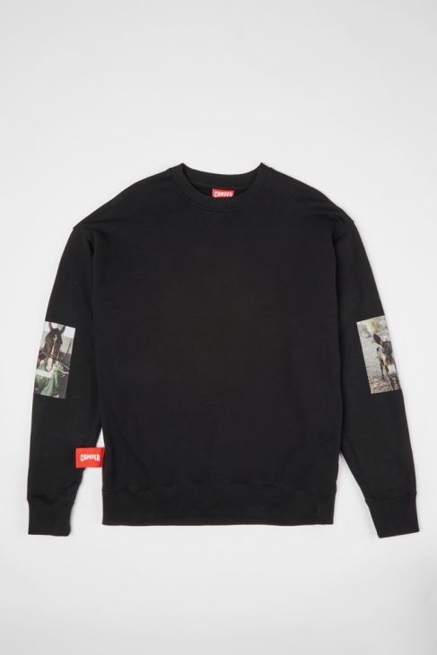 Μαύρο μακρυμάνικο φούτερ από 100% οργανικό βαμβάκι με λαιμόκοψη με στάμπα γαϊδούρας και στα δύο μανίκια και ετικέτα με το λογότυπο Camper κάτω δεξιά. Αυτό το Casual μεγάλο φούτερ διαθέτει μια εικόνα σαν αφίσα ενός γαϊδάρου των Βαλεαρίδων από την καμπάνια του Camper ‘The Walking Society’ και στα δύο μανίκια. Εμπνευσμένη από τις ρίζες της μάρκας, το μεσογειακό νησί της Μαγιόρκα, η συλλογή συνδυάζει ιππικά μοτίβα με οργανικό βαμβάκι υψηλής ποιότητας και σύγχρονα σχήματα για καθημερινή χρήση. Μέγεθος και FitUnisex Σχεδιασμένο για χαλαρή και υπερμεγέθη εφαρμογή Το αρσενικό μοντέλο είναι 187 Cm και φοράει μέγεθος L Το γυναικείο μοντέλο είναι 175 Cm και φοράει μέγεθος M