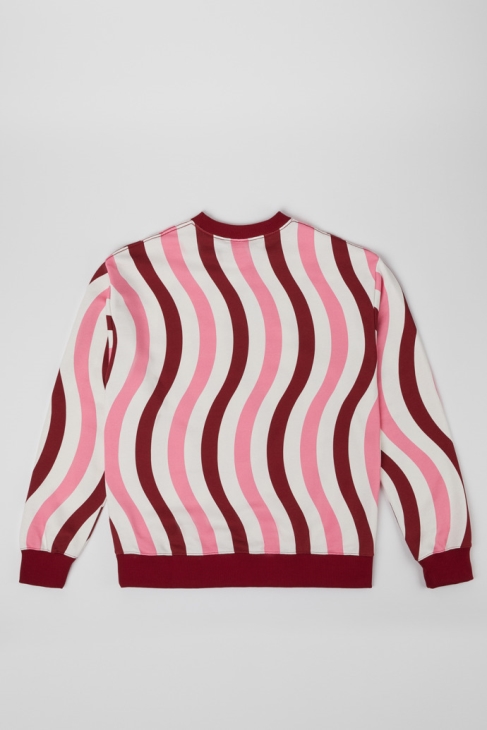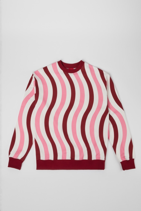 Λευκό, ροζ και μπορντό, οργανικό βαμβακερό Unisex πουλόβερ με κυματιστό ριγέ σχέδιο.