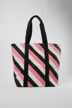 Μαύρο, ροζ και λευκό ριγέ ανακυκλωμένο βαμβακερό τσαντάκι με τρεις θήκες. Με λειτουργικές σχεδιαστικές λεπτομέρειες, μη συμβατικούς χρωματικούς συνδυασμούς και καλύτερα υλικά, οι τσάντες Ado προσθέτουν μια παιχνιδιάρικη πινελιά σε κάθε ντύσιμο.