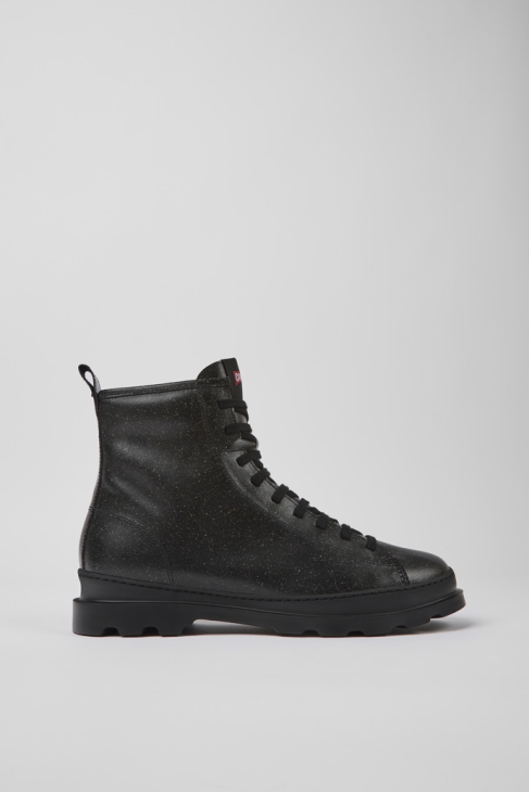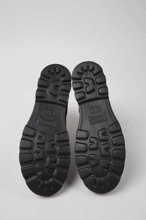 Μαύρα ανδρικά μποτάκια με πάνω μέρος MIRUM 100% βιολογικής βάσης και εξωτερικές σόλες XL EXTRALIGHT Organix (30% βιολογικής βάσης ζαχαροκάλαμο). Ένα πρωτότυπο Camper από το 1986 με εμβληματικό αστικό σχέδιο. Το Brutus είναι ανθεκτικό χάρη στη ραφή 360′ και διαθέτει ελαφριά τεχνολογία.