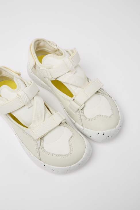 Γυναικεία ημι-ανοιχτά πάνινα παπούτσια από λευκό ανακυκλωμένο PET, οργανικό βαμβάκι και δέρμα με εξωτερικές σόλες XL EXTRALIGHT® Sustainable+ (51% ανακυκλωμένο EVA) και σύστημα κλεισίματος με γάντζο και βρόχο. Το Peu Stadium είναι μια ανανεωμένη εκδοχή του εμβληματικού μας Peu Cami, με έντονο όγκο και έξυπνες λεπτομέρειες για μια πιο σύγχρονη εμφάνιση.