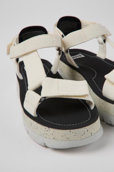 Λευκό πέδιλο για γυναίκες. Ιμάντες από 100% ανακυκλωμένο ύφασμα PET με κλείσιμο με Velcro. 100% λευκή εξωτερική σόλα EVA πλατφόρμας. Λίγο καλύτερα, ποτέ τέλειαΤα σανδάλια μας Oruga Up σχεδιάστηκαν για τις καλοκαιρινές μέρες και διαθέτουν μια παχιά χαρακτηριστική σόλα για μεγαλύτερο ύψος και μοναδική εμφάνιση.