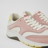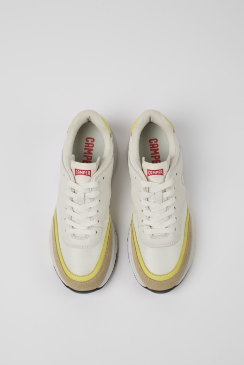 Λευκά και μπεζ ανακυκλωμένα γυναικεία αθλητικά παπούτσια PET και δέρμα με πατώματα και εξωτερικές σόλες από PU από 70% EVA και 30% καουτσούκ. Τα αθλητικά μας Drift διαθέτουν ελαφριά κατασκευή και σπορ σιλουέτα εμπνευσμένη από αθλητικά παπούτσια της δεκαετίας του ’90.