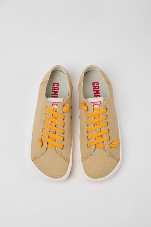 Μπεζ υφασμάτινα ανδρικά πάνινα παπούτσια με αφαιρούμενα πατώματα OrthoLite® Recycled™ και εξωτερικές σόλες από καουτσούκ. Το Peu Rambla μας διαθέτει χαρακτηριστικά ζιγκ-ζαγκ κορδόνια και ανάμεικτα υλικά για χαλαρή αίσθηση με διασκεδαστική εμφάνιση.